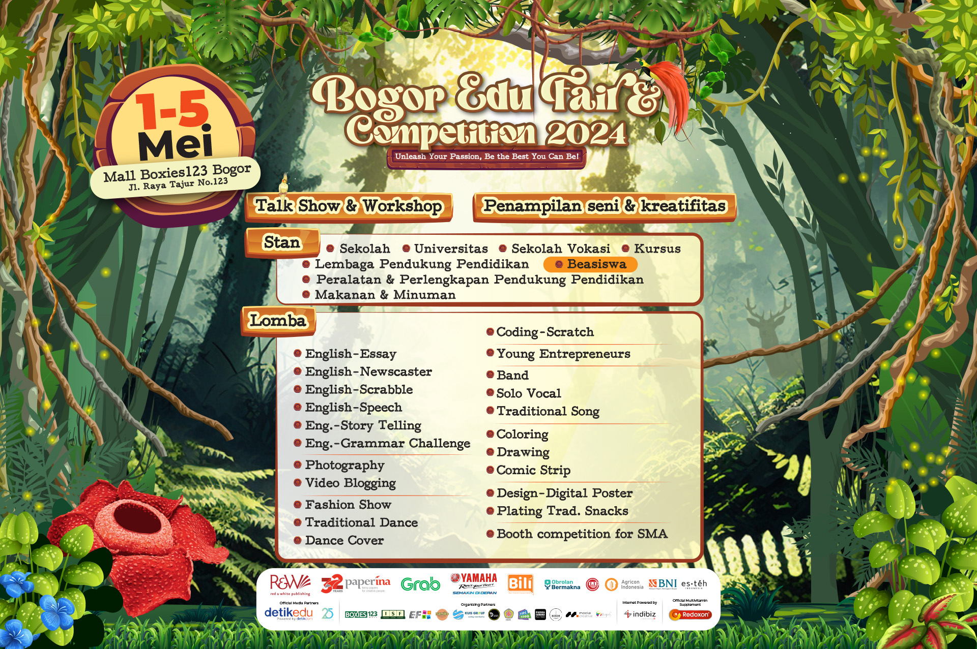Bogor Edu Fair & Competition 2024 dirancang untuk menjadi ajang silahturahmi antar sekolah, dengan menyediakan ruang berekspresi dan mengasah kemampuan tertentu bagi para peserta didiknya. Dilengkapi dengan 29 kompetisi dari 23 kategori perlombaan, diharapkan diikuti oleh para peserta antar sekolah dari tingkat dasar hingga menengah. Ikuti setiap detil acara yang akan kami suguhkan dengan mengunjungi situs web kami secara teratur. Kami berharap dapat melihat Anda